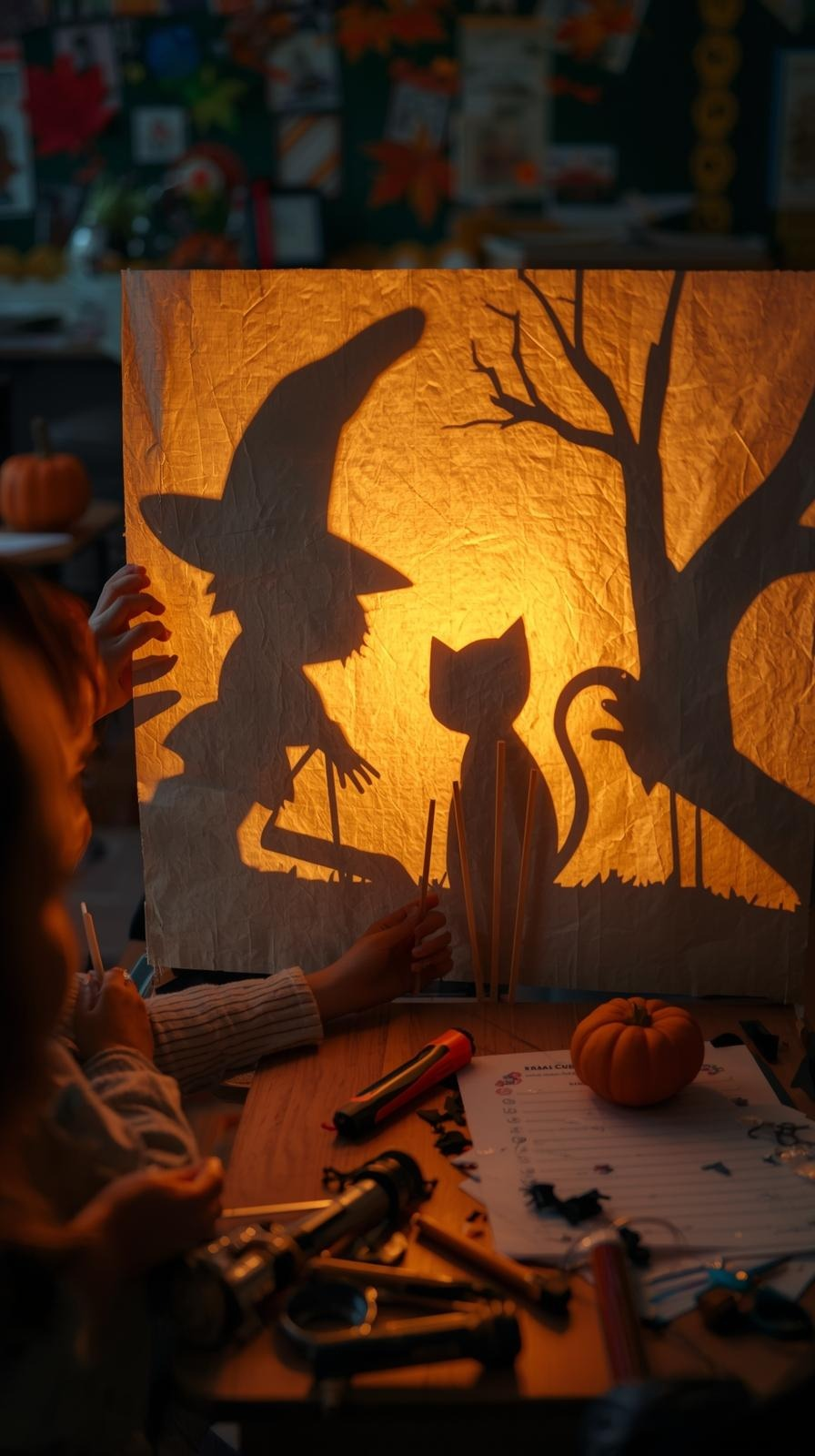 Dzieci tworzą własny teatrzyk cieni z postaciami z bajki: Samem, mamą, drzewem i „czarowniczym” cieniem.