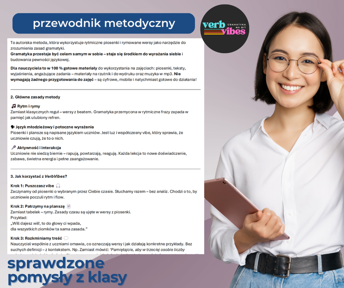 Nie zniechęcamy dzieci od startu, tylko włączamy im viralową, rytmiczną piosenkę, która koduje całą analityczną wiedzę w sposób lekki, przyjemny i nowoczesny. To gotowa, kompletna lekcja dla klasy 4, 5, 6, 7, 8, a także dla dorosłych – materiały, które będą przydatne nie przez jeden rok, ale w wielu grupach i kontekstach. Dzięki nim odczarujesz gramatykę i pokażesz, że można ją przekazać inaczej – kreatywnie i skutecznie.