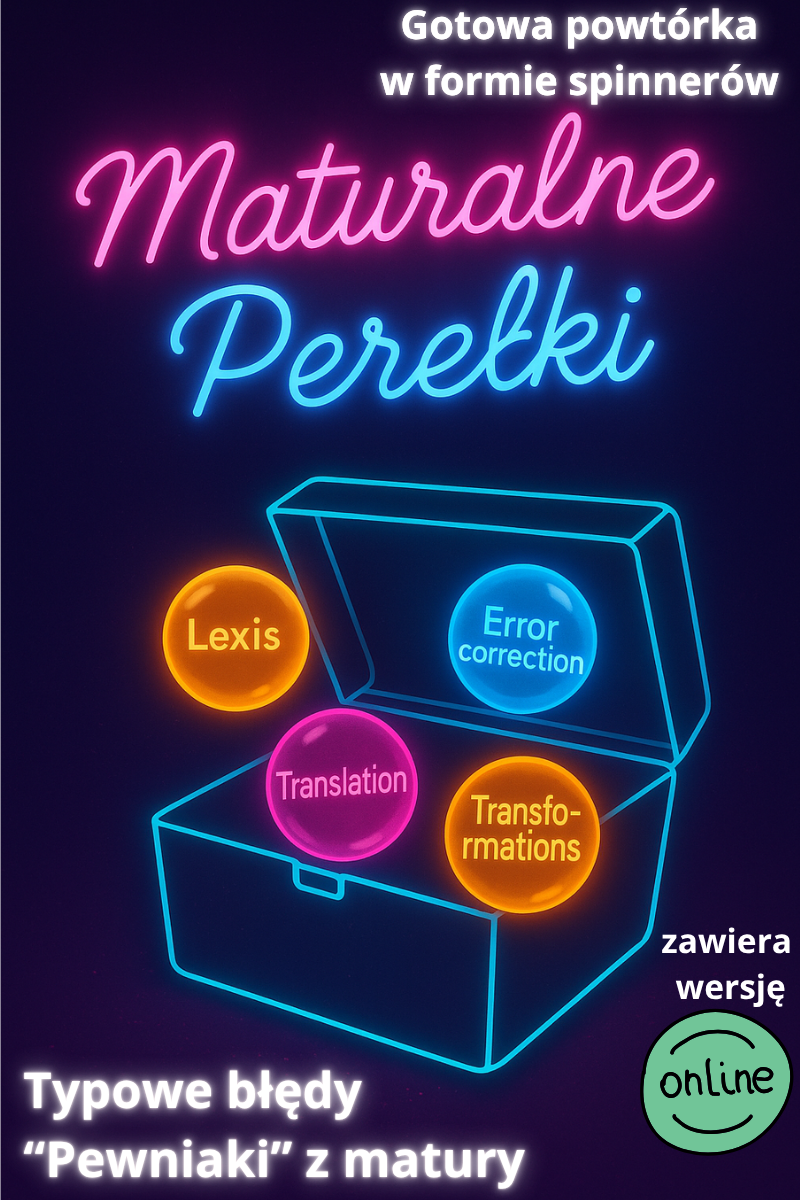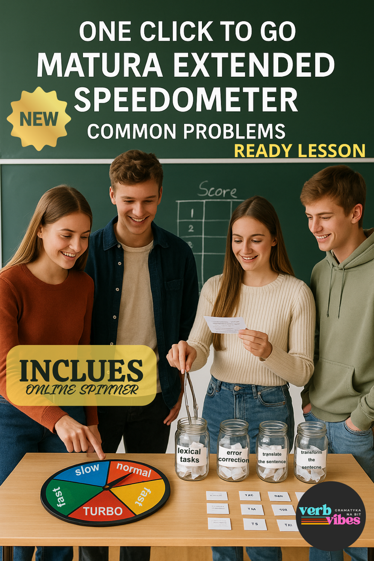 Aktywność można przeprowadzić w klasie w wersji papierowej (spinner + pytania w słoiczkach) lub w wariancie online (Wordwall). Dzięki różnym poziomom trudności każdy uczeń ma szansę włączyć się w pracę, a powtarzanie typowych maturalnych „pułapek” staje się dynamiczne i atrakcyjne.