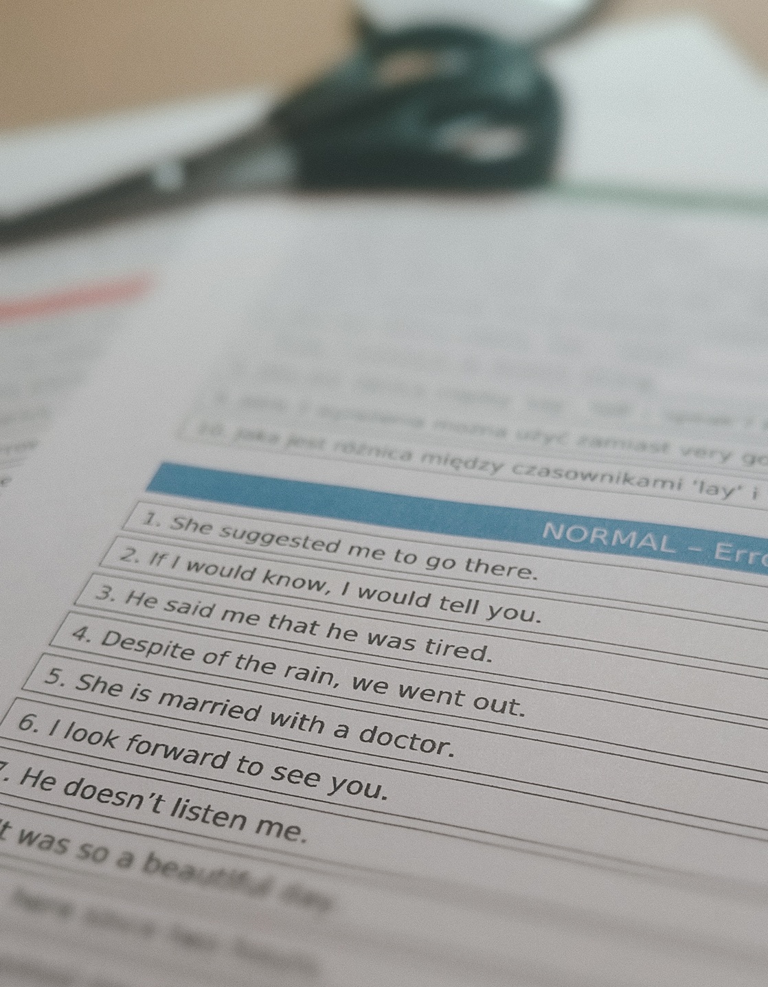 Normal (2 pkt) – error correction: znajdź i popraw błąd (np. She suggested for me to go there.),