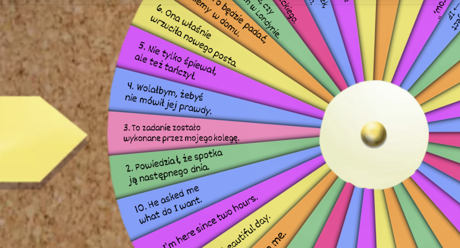 wersja online na Wordwall – gotowe koło fortuny z 40 pytaniami, idealne dla lekcji online lub jeśli nie masz czasu na wycinanie spinnera i pytań, a masz tablicę multimedialną.