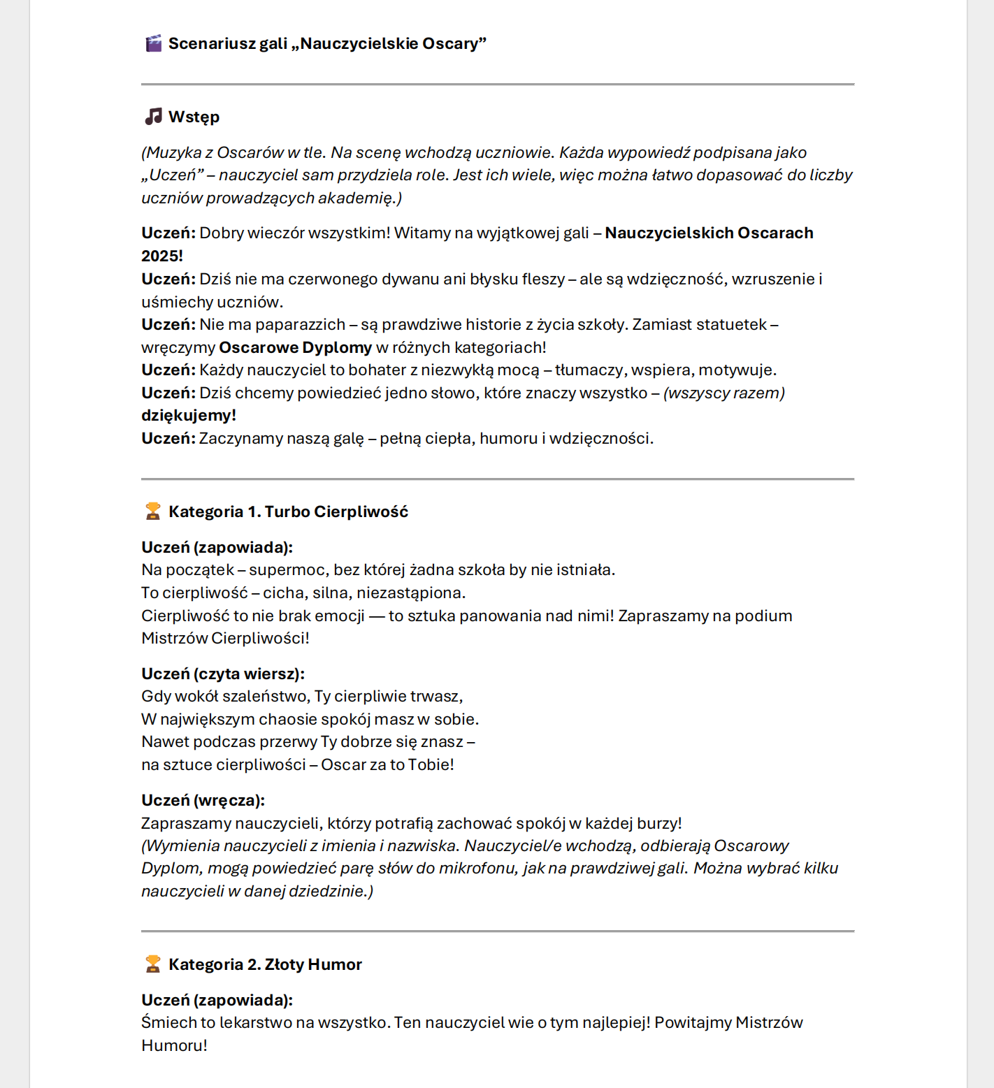 🏆 gotowy scenariusz gali z rymowanymi kategoriami i miejscem na wystąpienia nauczycieli,