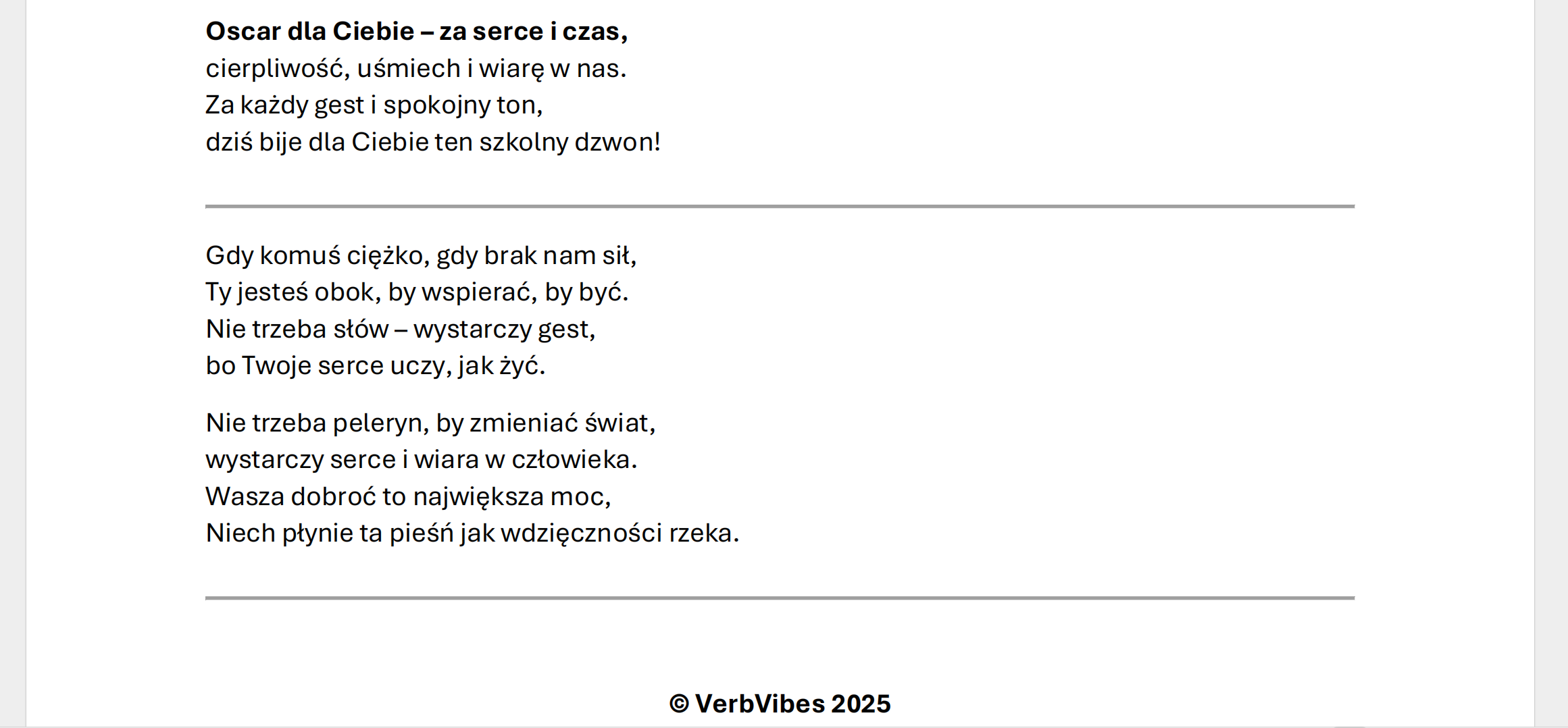 To wszystko po to, by Dzień Edukacji Narodowej stał się wyjątkowy – ciepły, wzruszający, z klasą. Bo przecież każdy nauczyciel zasługuje w tym dniu na czerwony dywan i owacje na stojąco. I taka będzie ta uroczystość.