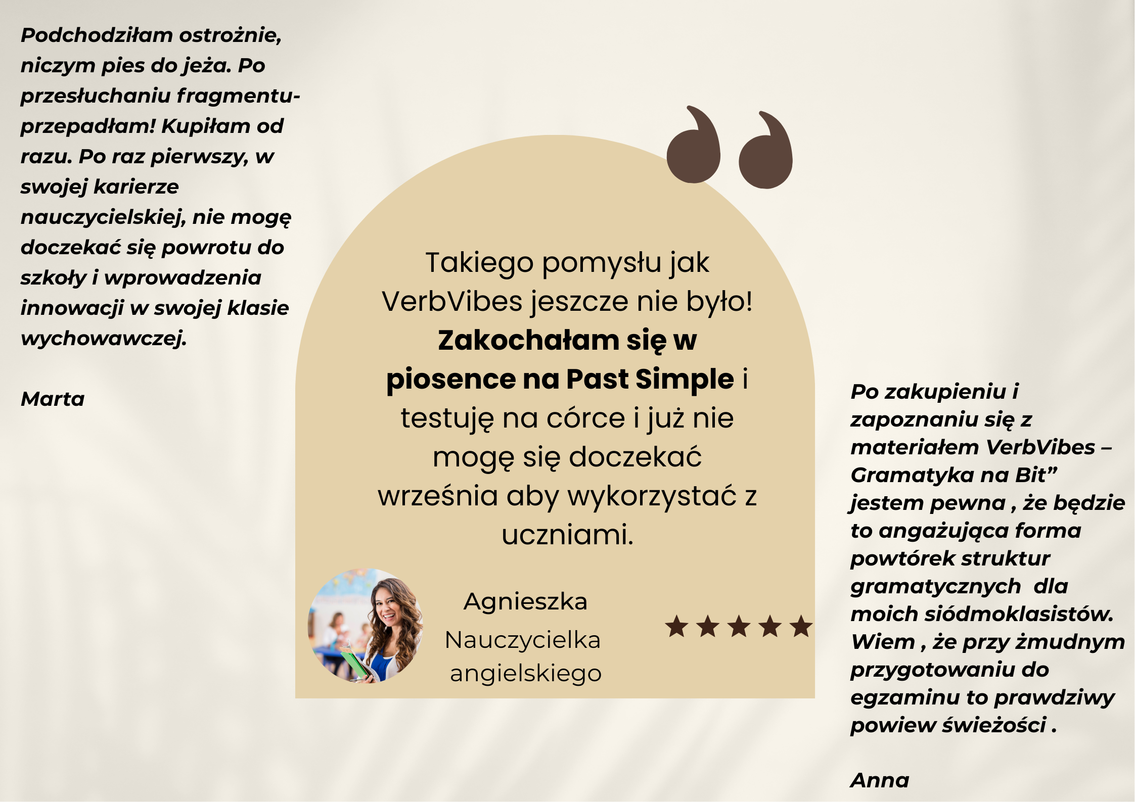 💡 Opinie nauczycieli? Sprawdź na stronie VerbVibes na Facebooku! Oto kilka z nich. Przekonaj się sama, czemu nauczycielki zakochały się w bicie na Past Simple i mojej innowacji #Grammar_Meets_HipHop!