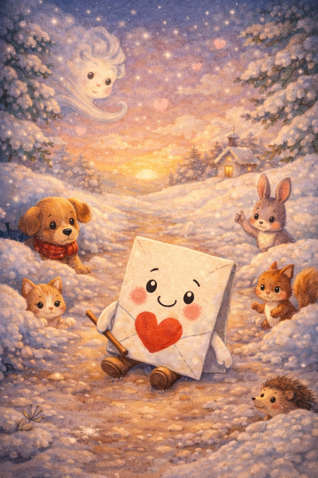 Kartka wyrusza w drogę, przypadkowo wypada z torby listonosza, ale nie zostaje sama – do domu babci i dziadka pomagają jej dotrzeć na czas przeróżne zwierzątka i żywioły, które dzieci uwielbiają: piesek, kotek, zajączek, jeżyk, wiewiórka, gołąbek, wróbelek, śnieżynka i wiatr.