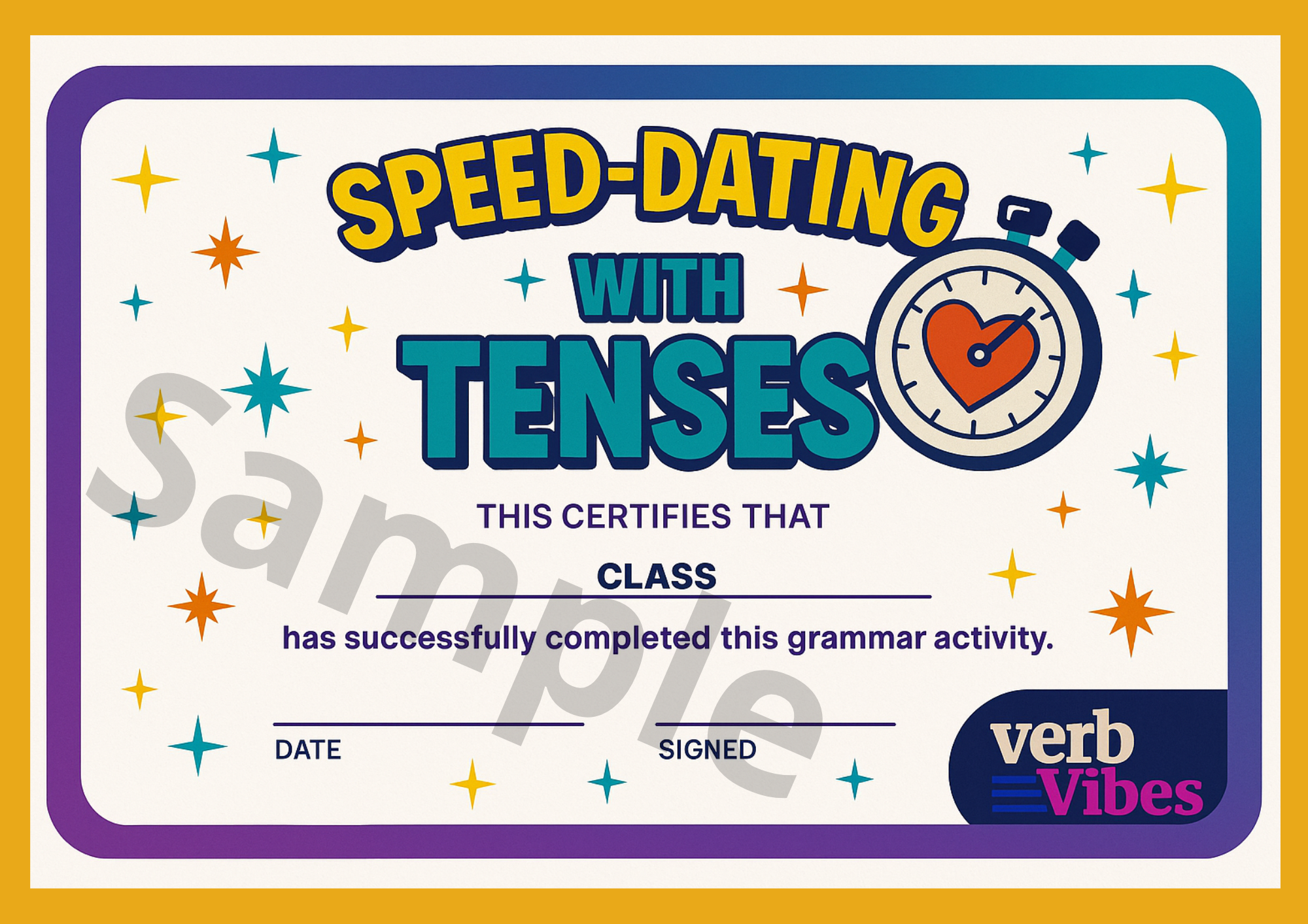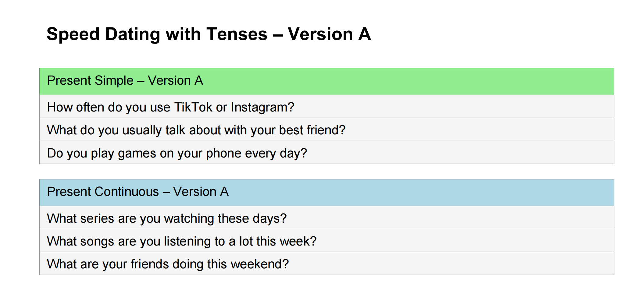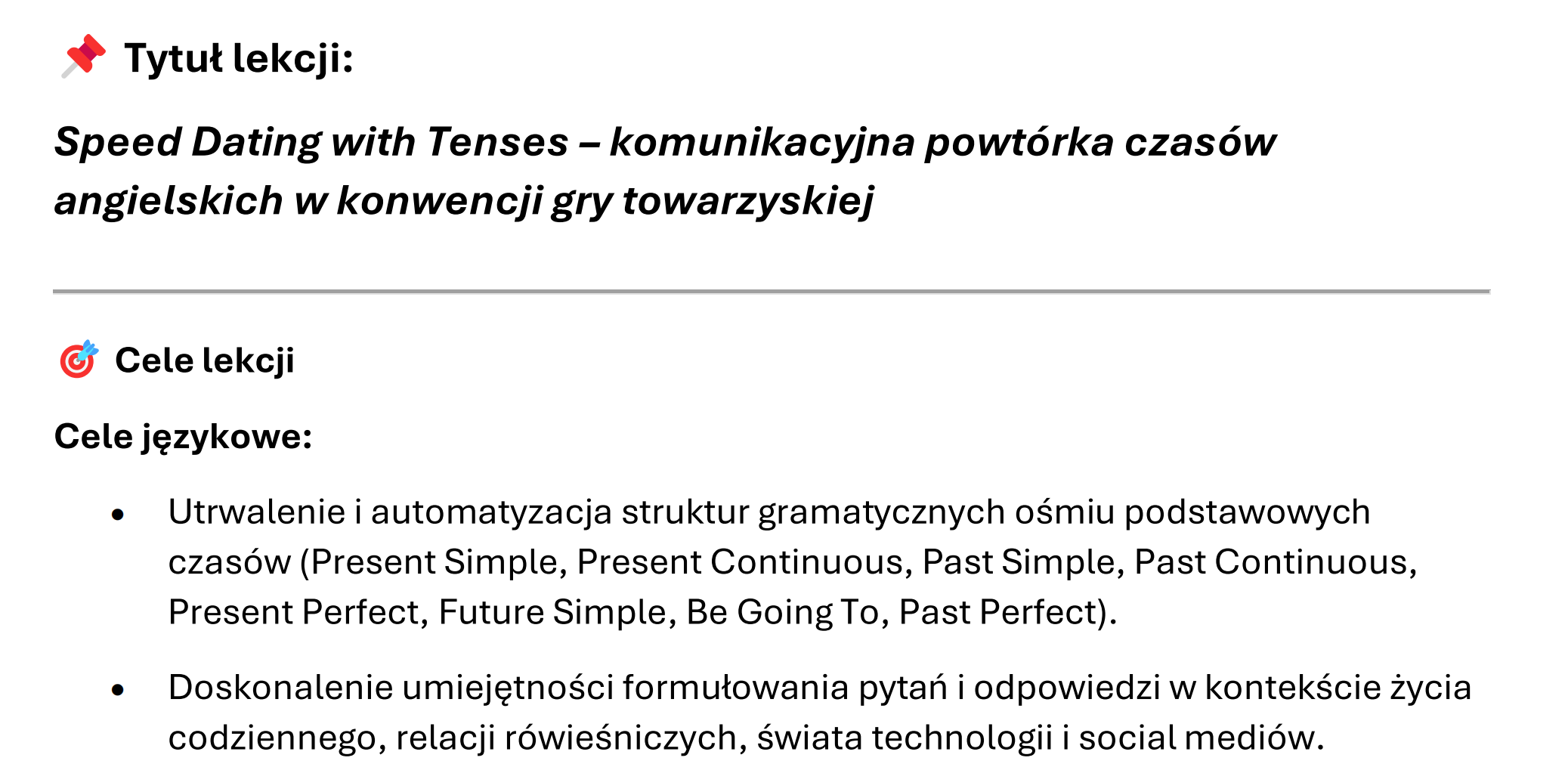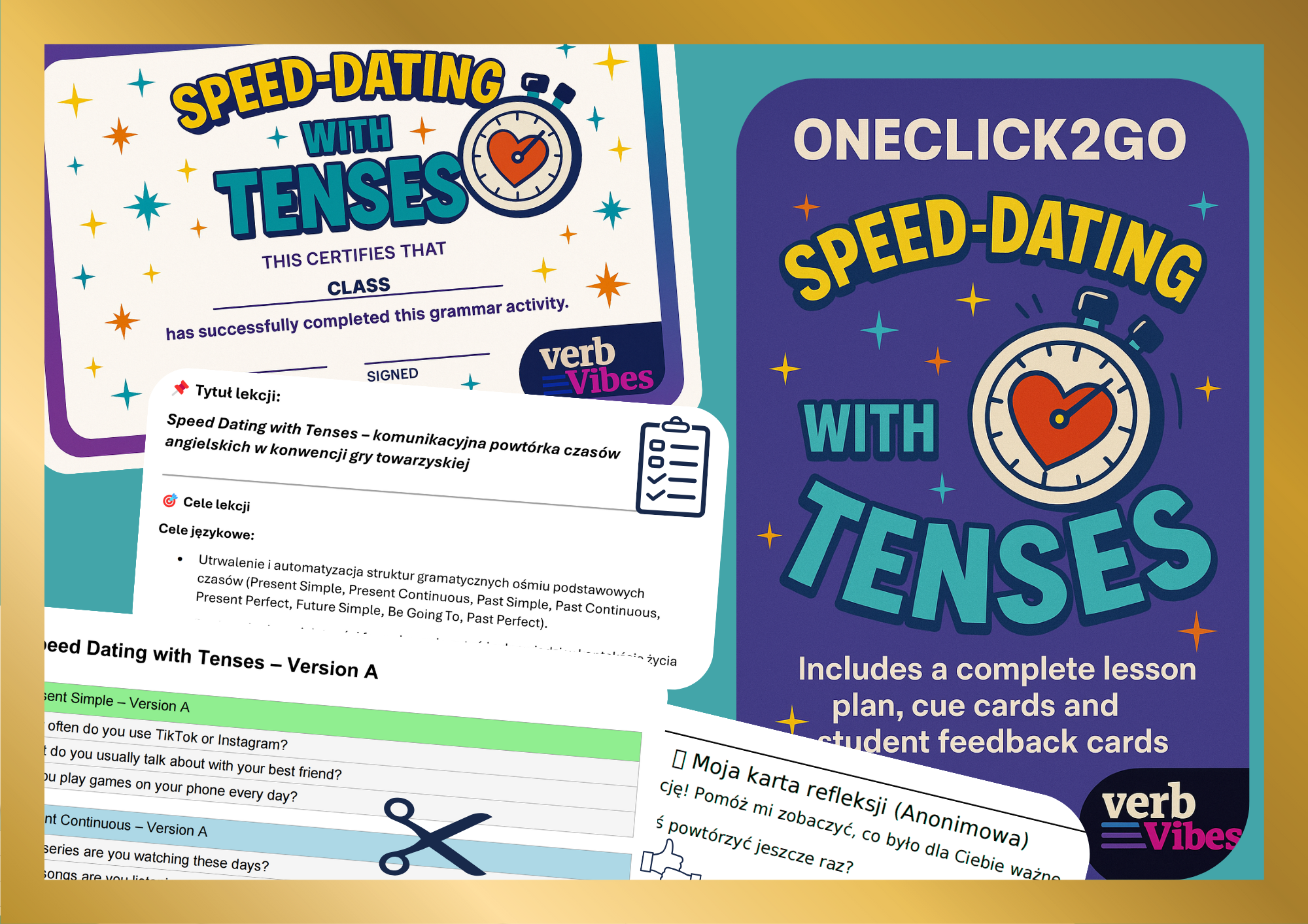 Dodaj energii i struktury swojej lekcji dzięki Speed Dating with Tenses z serii VerbVibes OneClick2GO. To kompletna, gotowa do użycia lekcja, którą wdrożysz w kilka minut i uzyskasz maksymalny efekt. Uczniowie powtarzają 8 kluczowych czasów angielskich w zabawnej, dynamicznej formule speed datingu – zmieniając partnerów, zadając autentyczne pytania i ćwicząc płynność w komunikacji. Pytania są angażujące i oparte o ich świat - social media, social life, technology, itp.