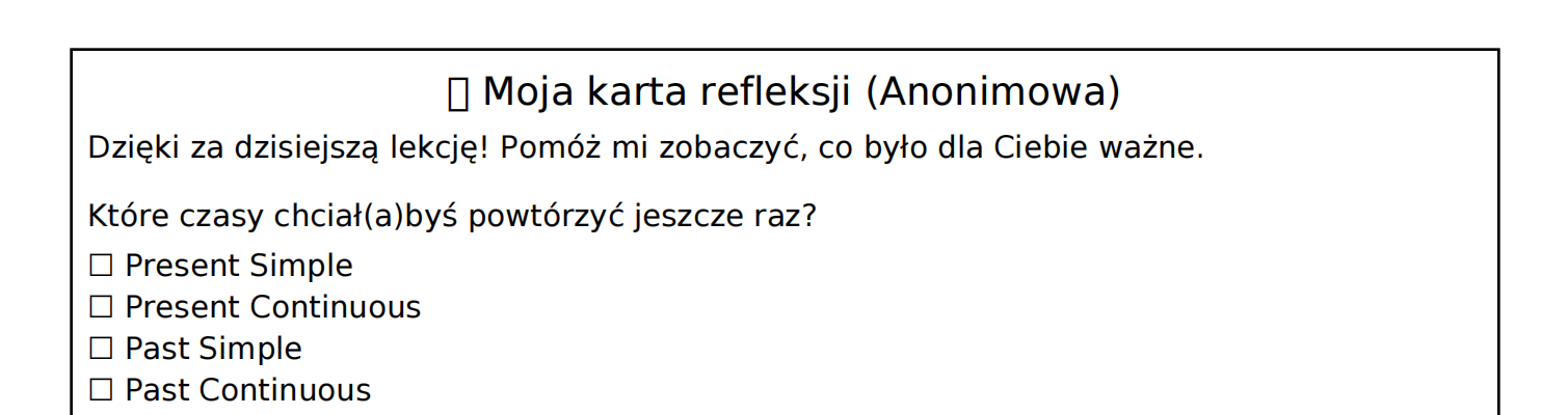 Print-friendly karty refleksji/samooceny do druku, w których uczniowie anonimowo mogą zaznaczyć, które czasy chcieliby powtórzyć - nieoceniony feedback dla Ciebie.