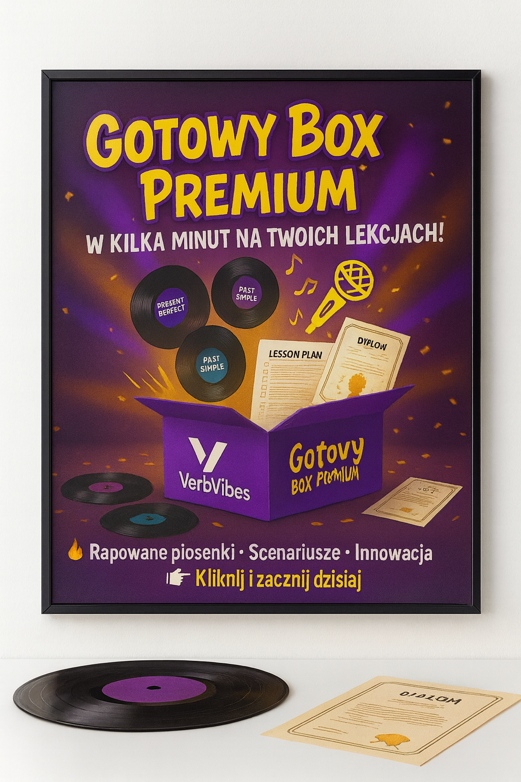 I ważna rzecz - razem z tym Boxem otrzymujesz ode mnie kompleksowy dokument na zgłoszenie, wdrożenie i ewaluację innowacji pedagogicznej 'To nie lekcja angielskiego, to VerbVibes - ucz w ich rytmie'. Dokument zawiera założenia, metody, zgodność z podstawą programową, cele krótko/długoterminowe, spodziewane efekty oraz ankietę dla nauczyciela i uczniów. Drukujesz, podpisujesz, składasz w szkole i wdrażasz! A efekty? Przerosną Twoje najśmielsze oczekiwania!