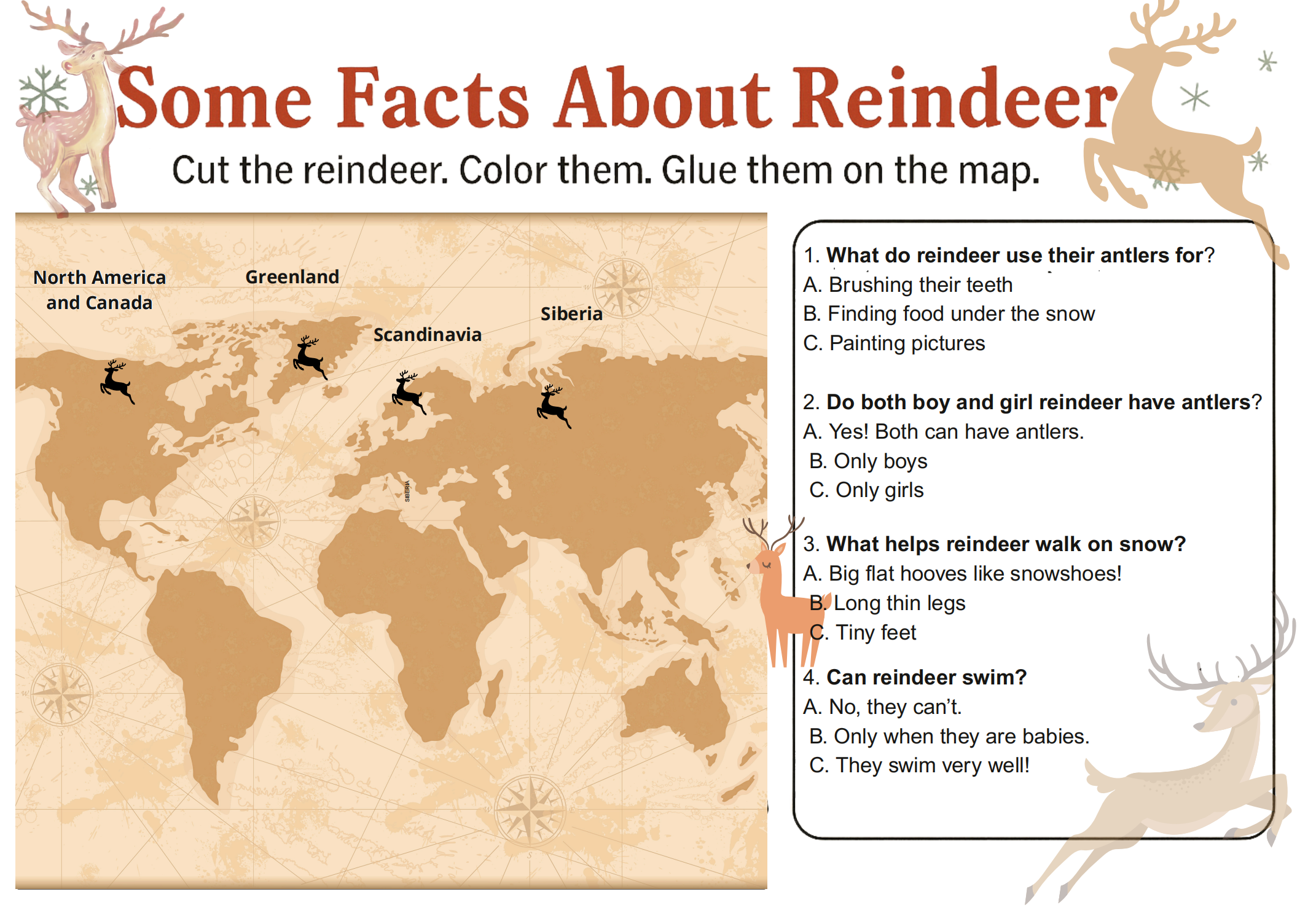 🦌 3. Karta pracy: mapa świata + renifery + mini-quiz