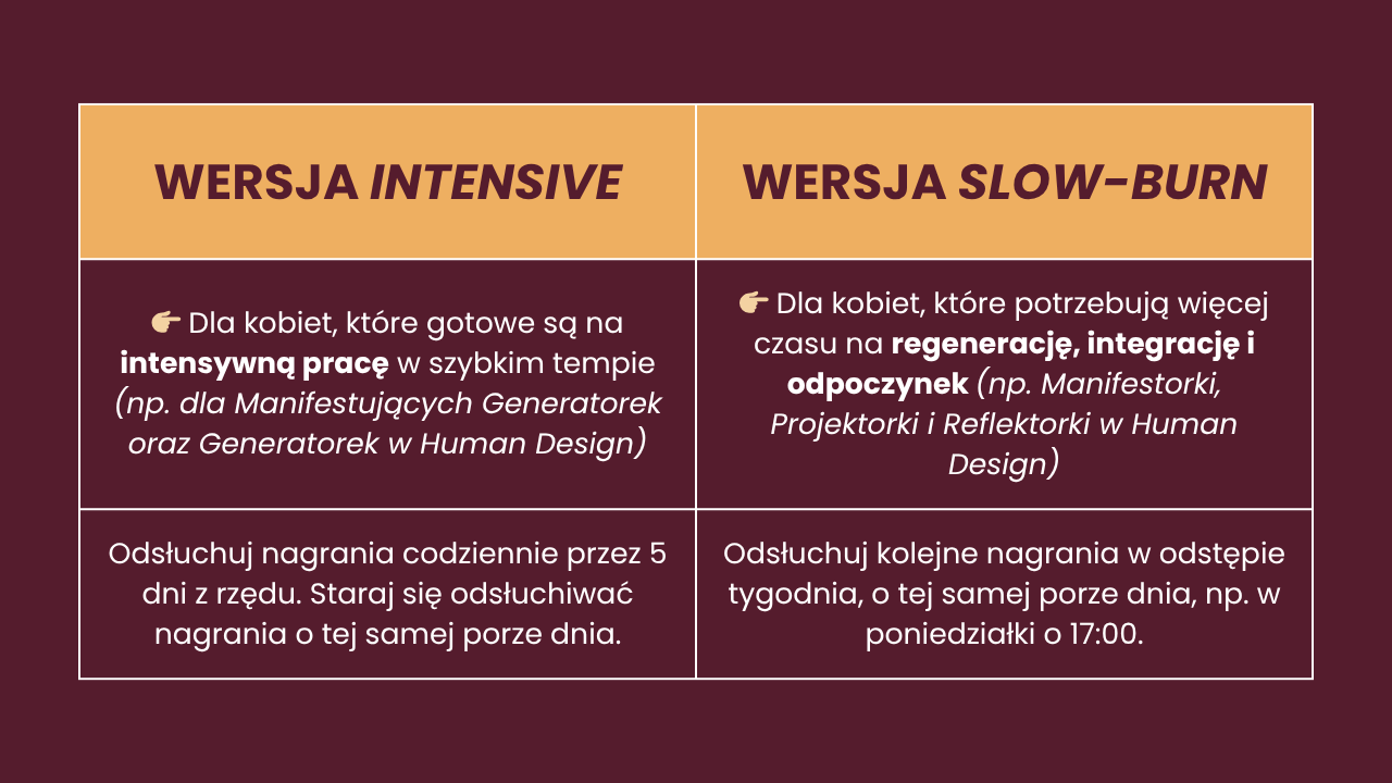 Procesy, do których zyskujesz tutaj dostęp są naprawdę mocne, potrafią być intensywne, wyzwalać emocje i otwierać Cię na zupełnie nowe paradygmaty mentalne i energetyczne, dlatego zapraszam Cię do tego, abyś nie odsłuchiwała więcej niż jedno nagranie dziennie.