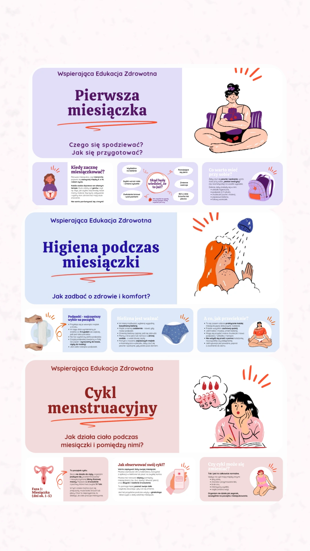 – 3 merytoryczne i estetyczne prezentacje: o pierwszej miesiączce, higienie menstruacyjnej i cyklu miesiączkowym,