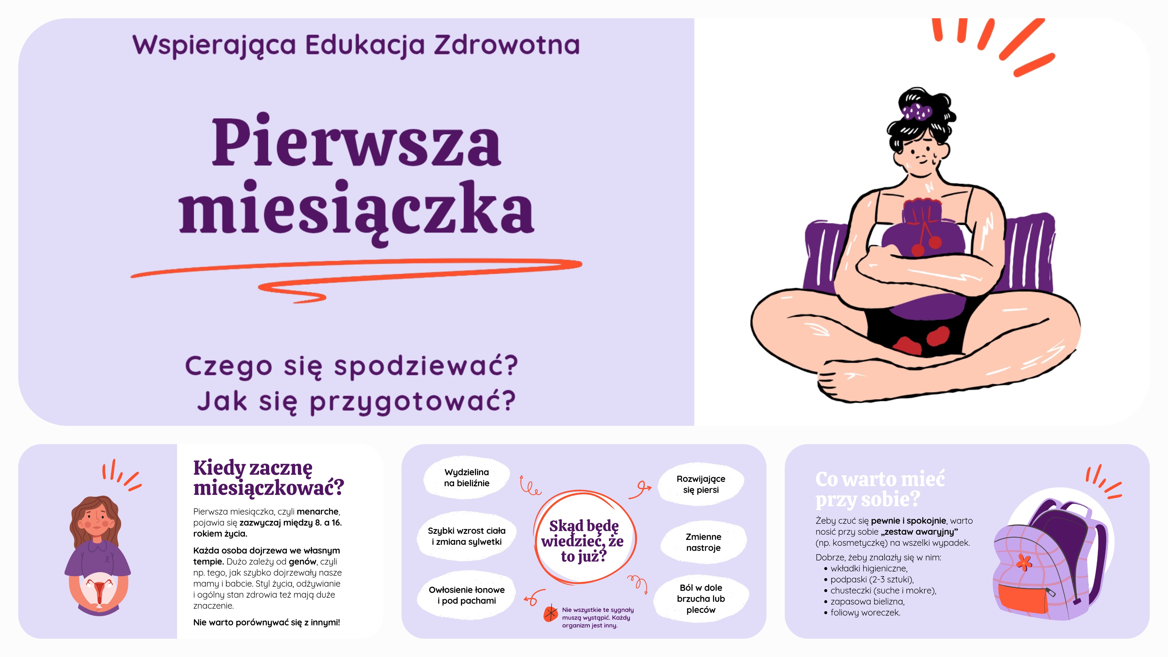 ✨ Prezentację multimedialną – merytoryczne i estetyczne slajdy, które prowadzą krok po kroku przez temat pierwszej miesiączki, poprzedzających ją etapów, wraz z pomysłami, jak się do niej przygotować.